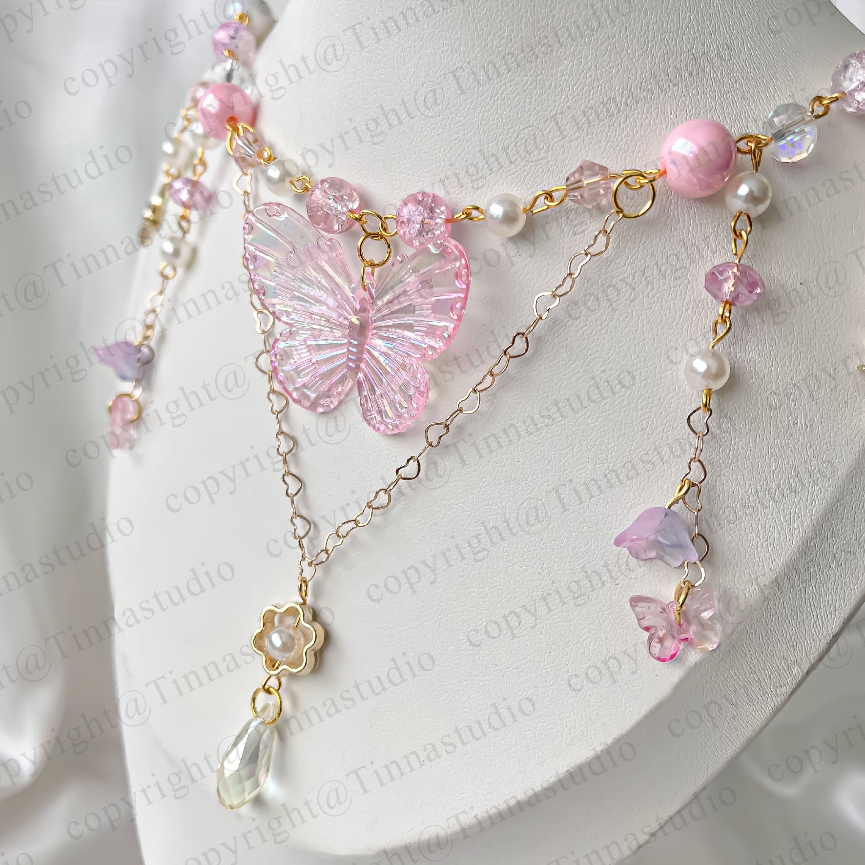 Choose from three enchanting colorways: blush pink, pastel lilac, or soft sky blue — each offering its own dreamy vibe. The layered design features a luminous central butterfly and a delicate cascade of beads and charms, all anchored on gold-plated stainless steel for a durable yet luxe finish.