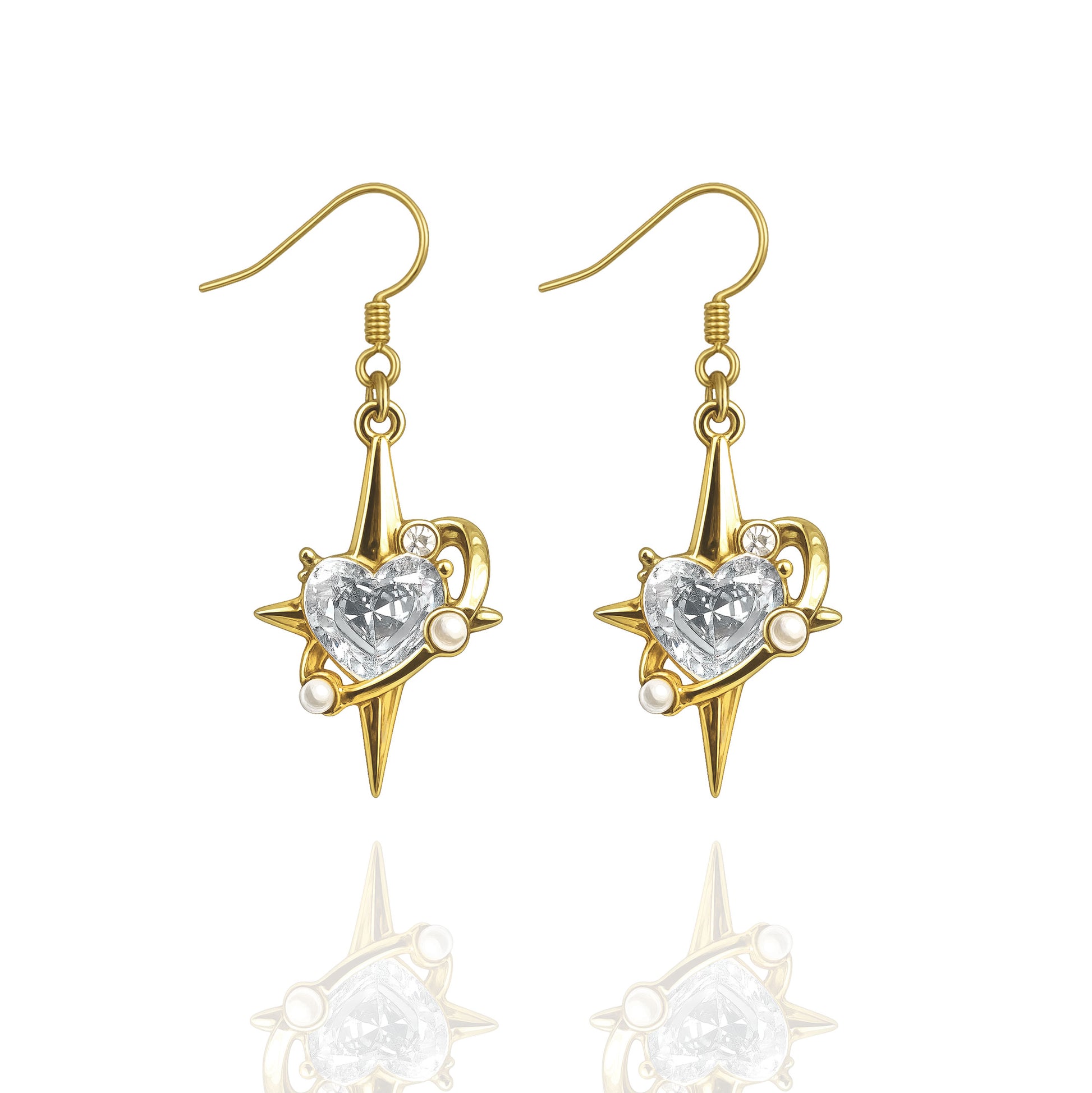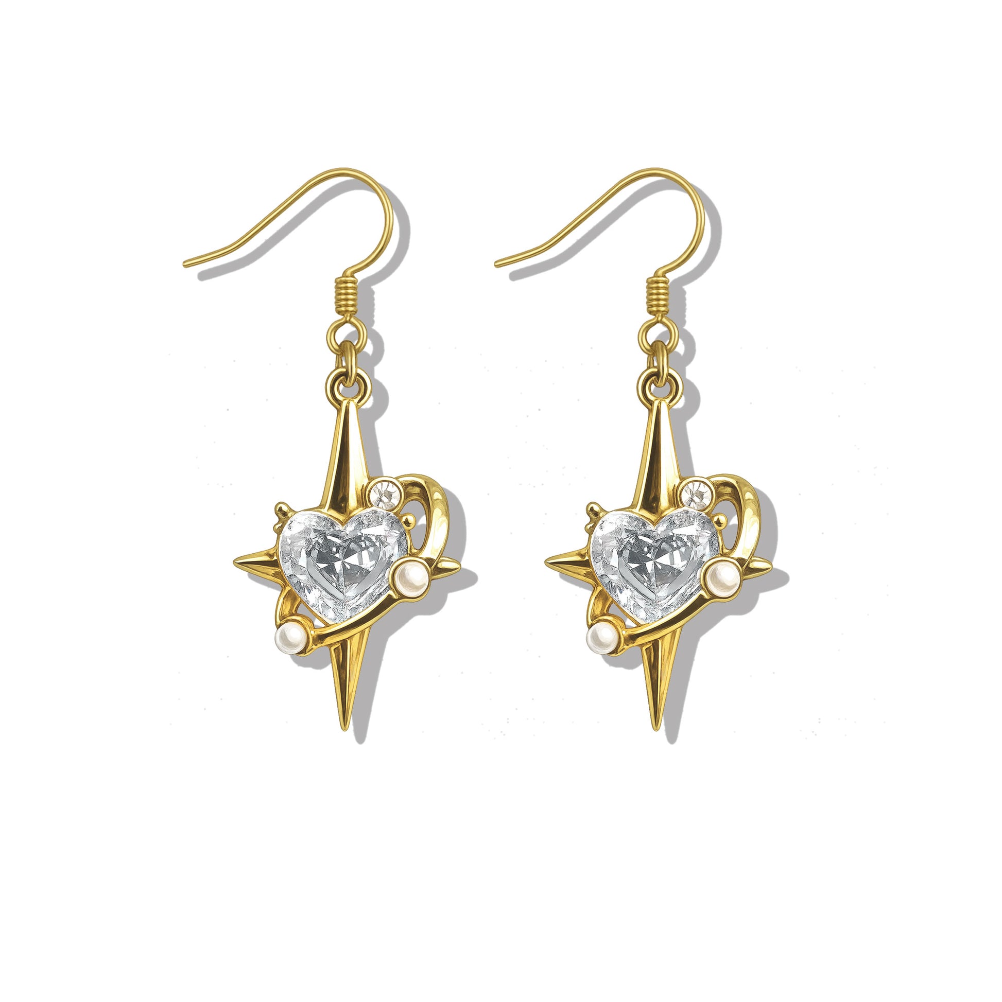 Channel radiant energy with our Stellar Heart Drop Earrings in gold. This limited-edition version brings a warm, dreamy twist to our signature design — heart-cut rhinestones nestled in golden starbursts, accented with soft pearls and curved orbit-like arcs.